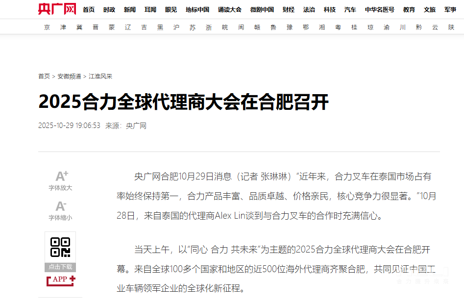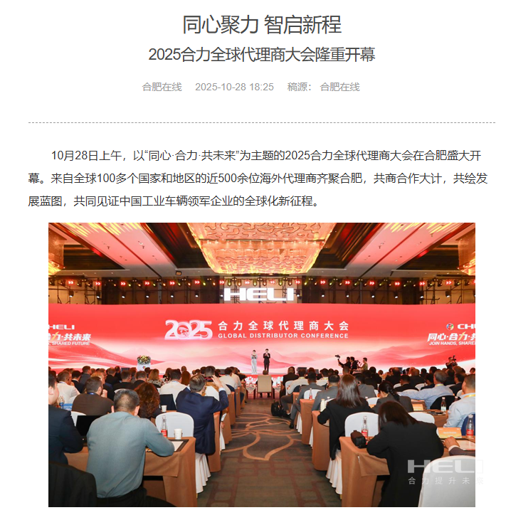 10月28日至31日,“同心?合力?共未來”2025合力全球代理商大會在合肥召開,引發媒體廣泛關注,新華社安徽分社、中央廣播電視臺安徽總站、經濟日報、證券日報、央廣網、中國工業報、人民網安徽頻道、新華網安徽頻道、安徽日報、安徽新聞聯播等28家媒體、46名記者蒞臨現場。中央、省內外及香港、行業媒體競相報道或轉載報道,內容涵蓋戰略發布、智能成果及全球化布局,形式多元、視角鮮活,立體展現合力“智能+綠色”發展新動能,奏響高質量發展強音。