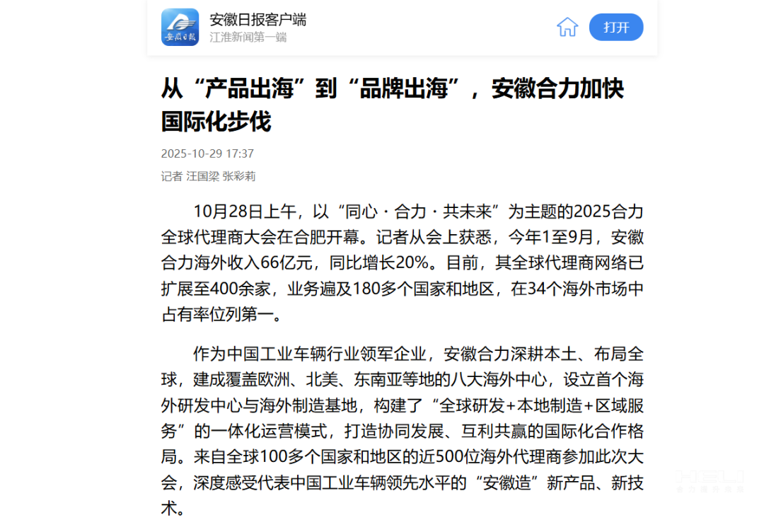 安徽日報客戶端丨從“產品出海”到“品牌出海”,安徽合力加快國際化步伐